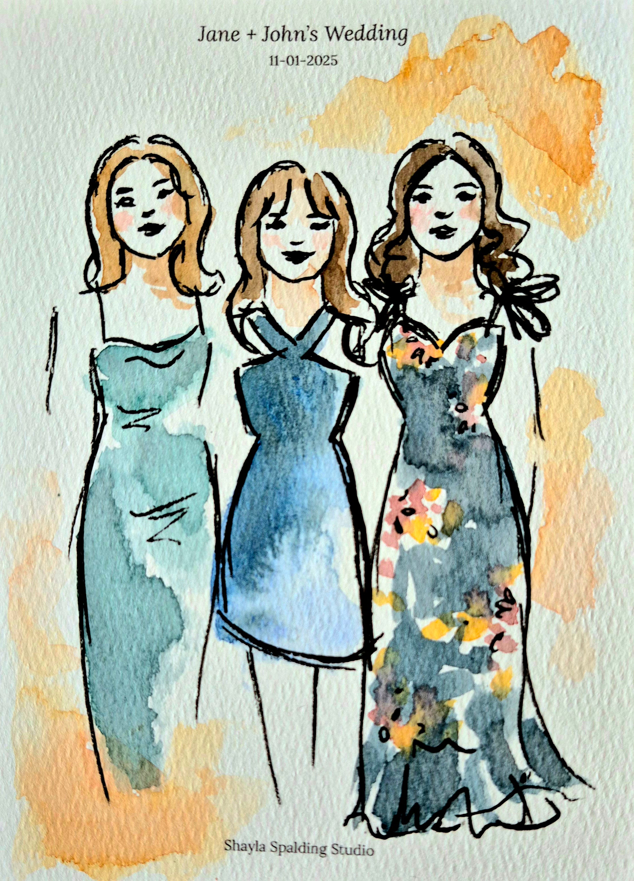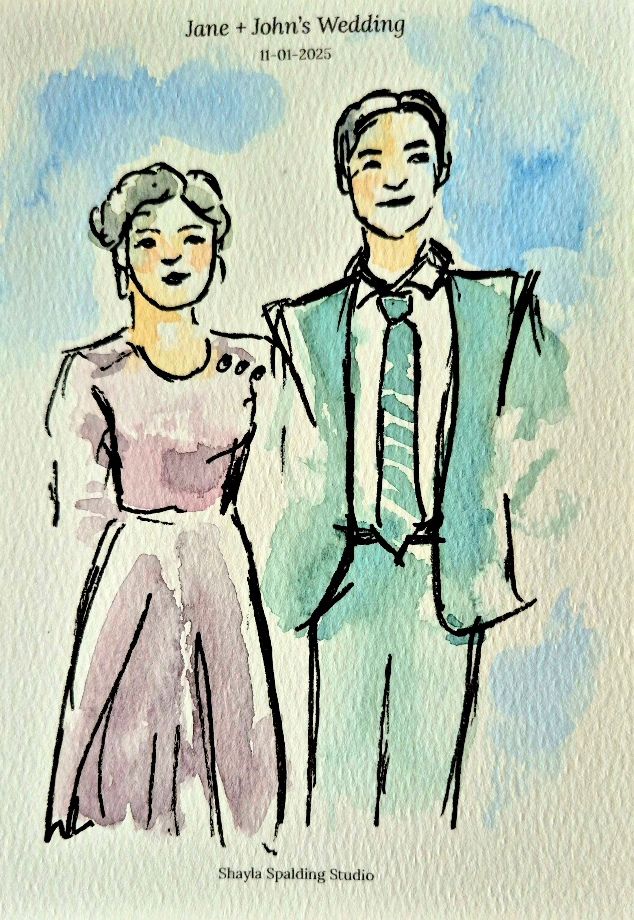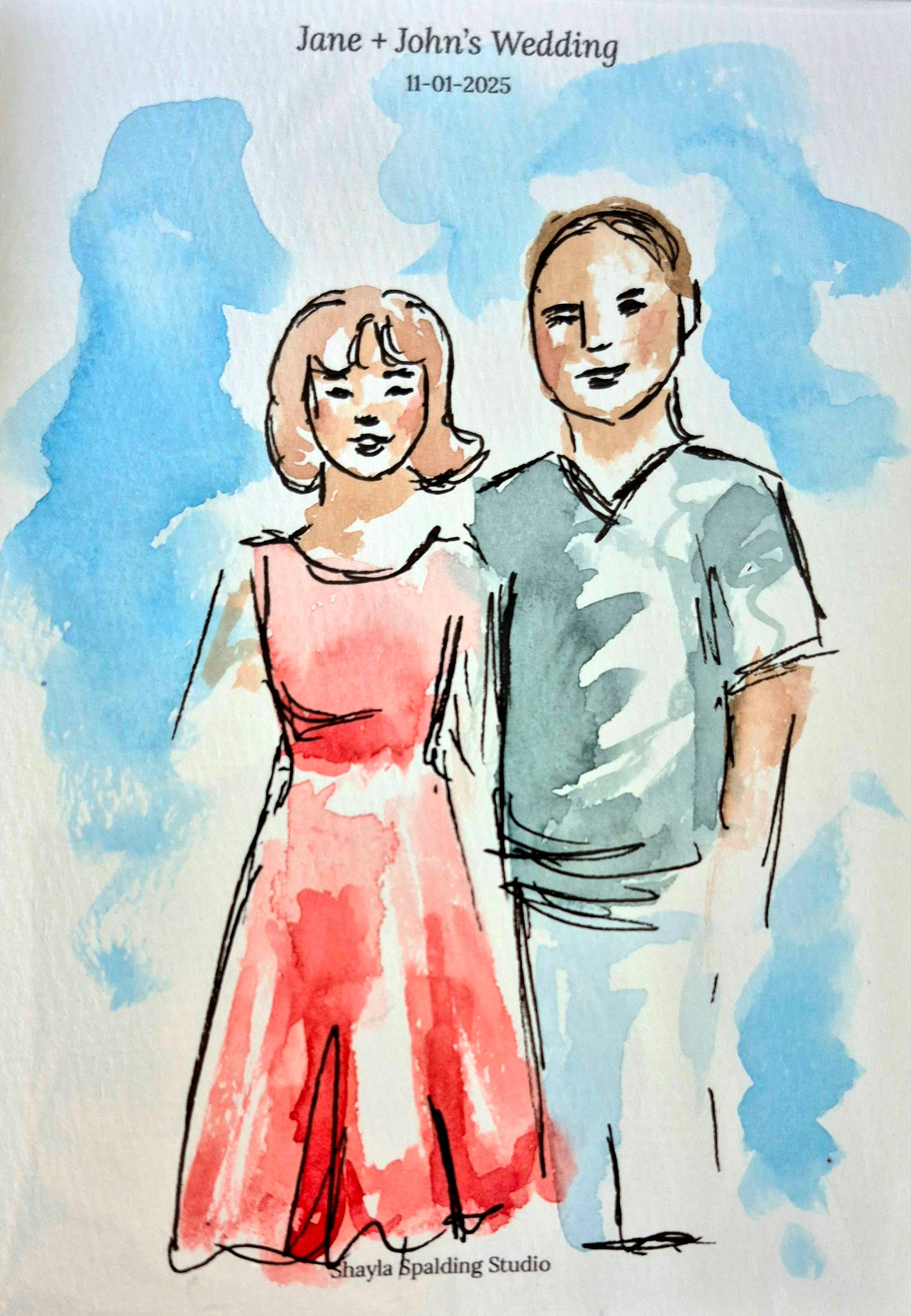 Includes up to 5 hours of live painting at the event and 40 to 50 guest portraits (or 20 to 25 couples) painted at the wedding.